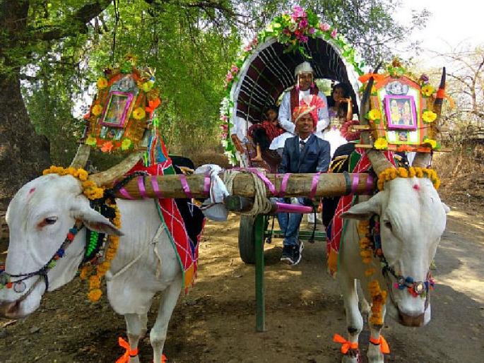 शेतकऱ्याच्या लेकाच्या लग्नाला व-हाडी निघाले बैलगाडीतून