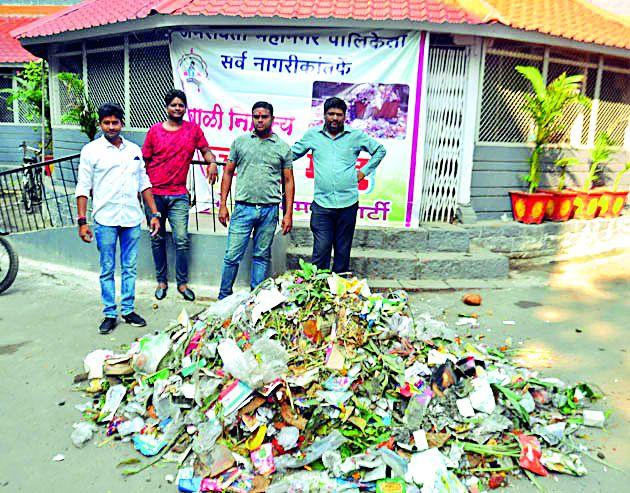 शहरातील अस्वच्छतेला आयुक्त हेमंत पवार व स्थायी समिती सभापती तुषार भारतीय ही दुक्कली जबाबदार असल्याचा आरोप करीत युवा स्वाभिमानने आयुक्तांच्या दालनाबाहेर कचºयाचा ढीग लावला.