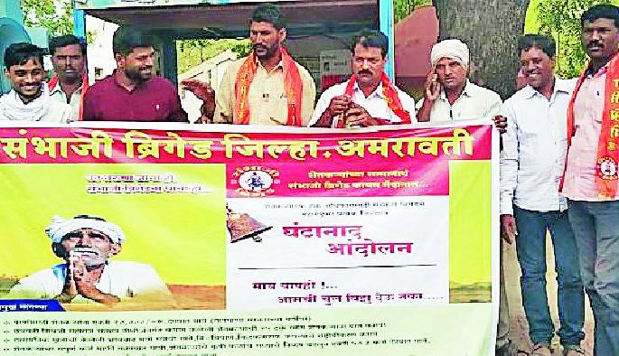 लोकमत न्यूज नेटवर्कअमरावती : राज्यात दुष्काळामुळे शेतकरी वर्ग विविध संकटांचा सामना करीत आहेत. खरीप हंगामाला सुरुवात झाल्याने आर्थिक अडचणीत असलेल्या शेतकऱ्यांना सरसकट कर्जमाफी द्यावी, यांसह अन्य मागण्यांसाठी मंगळवारी संभाजी ब्रिगेडने जिल्हा कचेरीसमोर घंटानाद करीत शासनाचे लक्ष वेधले. मागण्यांचे निवेदन जिल्हाधिकारी शैलेश नवाल यांना दिले.पेरणीसाठी शेतकऱ्यांना एकरी दहा हजार रूपये देण्यात यावे, छत्रपती शिवाजी महाराज सन्मान निधी अंतर्गत कपात केलेली शेतकºयांची २५ टक्के रक्कम परत देण्यात यावी, रासायनिक खताची भाववाढ मागे घेण्यात यावी, खते, बी- बियाणे, कीटकनाशक कंपन्याचे राष्ट्रीयीकरण करावे, कृषिकर्जाचे सध्याचे निकष बदलून एकरी ५० हजार कर्ज द्यावे, शेती व्यवसायाला उद्योगाचा व संवैधानिक दर्जा देण्यात यावा, शेतकºयांचे २०१४ पर्यंतचे संपूर्ण वीज बिल माफ करावे, शेतीची कामे मनरेगा अंतर्गत समाविष्ट करावे, शेतकरीविरोधी कायदा रद्द करून भाव संरक्षण कायदा करण्यात यावा, शेतीमालाला उत्पादन खर्चावर आधारित व वेतन आयोगाचे धर्तीवर हमी भाव देण्यात यावा, कृषिपंप धारकांना विद्युत जोडणी तात्काळ देण्यात यावी व ती ऐच्छिक असावी आदी मागण्यांसाठी आंदोलन करण्यात आले. यावेळी संभाजी ब्रिगेडचे डॉ. अभय गावंडे, जिल्हाध्यक्ष रणजित तिडके, संजय ठाकरे, अंकुश साठे, शरद काळे, कुशल देशमुख, हर्षदीप चावके, शुभम शेरकर, दीपक लोखंडे, अजित काळबांडे, गजानन मानकर आदी सहभागी होते.