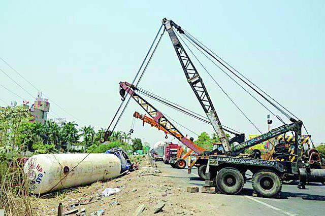 एलपीजीने भरलेला यूपी १७ एटी ४६९५ क्रमांकाचा महाकाय टँकर सुरतवरून वाडी (नागपूर) येथे नेण्यात येत होता. नांदगावपेठ टोल नाक्याजवळ नागपूरच्या दिशेने टँकर वळत असताना अचानक रस्तालगतचे कठडे तोडून उलटला. १७ ते १८ टन गॅस असलेल्या कंटेनरचे वजन ३५ टनाच्या आसपास होते. गॅस लिकेज झाला असता, तर चार ते पाच किलोमीटर परीसर बेचिराख झाला असता. मात्र, प्रशासनाने जलद पावले उचलून हा धोका टाळला. अग्निशमन दलासह गाडगेनगर पोलीस घटनास्थळी पोहोचले. अधिकाºयांनी क्रेन बोलावून टँकर चाकांवर ठेवण्यासाठी तीन क्रेन बोलावल्या. दुसरीकडे अग्निशमन चमू हातात फोम टेंडर घेऊन संभाव्य आग टाळण्यासाठी सज्ज होते.