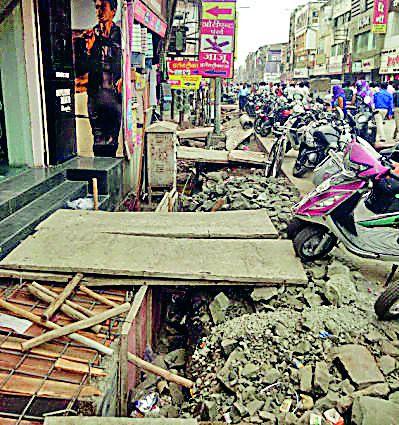 येथील जयस्तंभ चौक ते सरोज चौकापर्यंत काँक्रिटीकरणाचा रस्ता करण्यात आला. रस्त्याच्या दोन्ही बाजूला मोठी नाली खोदण्यात आली आहे. त्यावर स्लॅब टाकण्याचे कामे मंदगतीने सुरू असून, आणखी नागरिकांना किमान तीन आठवडे त्रास सहन करावा लागणार आहे.