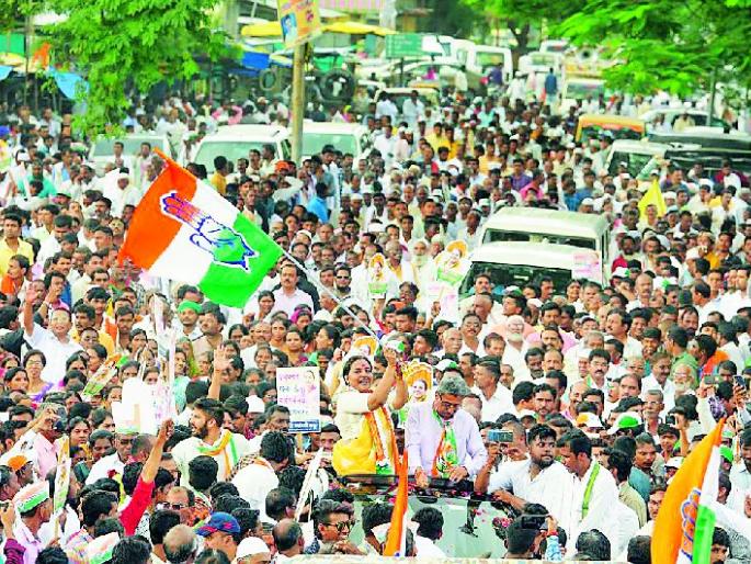 लोकमत न्यूज नेटवर्कतिवसा : प्रचंड घोषणाबाजी अन् जल्लोषात तिवसा विधानसभा मतदारसंघातील भारतीय राष्ट्रीय काँग्रेस, राष्ट्रवादी काँग्रेस व मित्रपक्ष आघाडीच्या उमेदवार आणि महाराष्ट्र प्रदेश काँग्रेसच्या कार्याध्यक्ष यशोमती ठाकूर यांनी हजारो समर्थकांच्या उपस्थितीत उमेदवारी अर्ज दाखल केला. त्यांच्या रॅलीला लाभलेले समर्थन लक्षवेधी ठरले.माजी मंत्री हर्षवर्धन देशमुख, राष्ट्रवादी काँग्रेसच्या संतोष महात्मे, महिला काँग्रेसच्या छाया दंडाळे, माजी नगराध्यक्ष गणेश राय, अजिजभाई, मुकद्दरखाँ पठाण, रमेश काळे, मुकुंदराव देशमुख, वीरेंद्रसिंह जाधव, हरिभाऊ मोहोड, मा.क.प.चे महादेव गारपगार, अनंतराव देशमुख, जिल्हा महिला काँग्रेसच्या अध्यक्ष उषा उताणे, जि.प. सदस्य अलका देशमुख, प्रदीप राऊत, दिलीप काळबांडे, शिरीष मोहोड, राजकुमार विघ्ने, साहेबराव लसनापुरे, मनोज देशमुख, तिवसा नगरपंचायतचे अध्यक्ष वैभव वानखडे आदी मान्यवर यावेळी उपस्थित होते.यशोमती ठाकूर यांनी उमेदवारी अर्ज दाखल करण्यापूर्वी गुरुकुंज मोझरी येथील राष्ट्रसंत तुकडोजी महाराज यांच्या महासमाधी स्थळावर नतमस्तक झाल्या. यानंतर त्यांनी तिवस्याकडे प्रयाण केले. यावेळी युवक काँग्रेसच्यावतीने भव्य दुचाकी रॅली काढण्यात आली होती, तर भातकुली, अमरावती, मोर्शी आणि तिवसा तालुक्यातील हजारो कार्यकर्ते उत्स्फूर्तपणे त्यांच्या या रॅलीत सहभागी झाले होते. तिवसा येथील सातरगाव रोडवरील एका शेतात प्रथम उपस्थित कार्यकर्त्यांचा मेळावा घेण्यात आला. त्यानंतर याच स्थळापासून ते तिवसा तहसील कार्यालयापर्यंत रोड शो करण्यात आला. कार्यकर्त्यांकडून यशोमती ठाकूर यांच्या समर्थनार्थ प्रचंड घोषणाबाजी करण्यात येत होती. विशेष म्हणजे, या रॅलीत महिला व युवती यांची संख्यासुद्धा लक्षणीय होती.मतदारसंघाचा सर्वांगीण विकास हाच ध्यास!तिवसा : रॅलीत सर्वत्र काँग्रेस पक्षाचे झेंडे आणि दुपट्टे घातलेले कार्यकर्ते यामुळे हा संपूर्ण परिसर व्यापून गेला होता.जनतेचे प्रेम, जिव्हाळा, आपुलकी आणि विश्वास हीच माझी खरी शक्ती आहे. महिलांचे हक्क आणि त्यांचे अधिकार याबाबतही मी सातत्याने आवाज उठविला आहे. शेतकऱ्यांचे प्रश्न असो की सिंचन, पिण्याचे पाणी याबाबतच्या समस्या, त्या सातत्याने विधानसभेत उपस्थित केल्या. केवळ विकास करणे हेच माझे ध्येय आहे आणि त्यासाठी मला परत तुमच्या आशीर्वादाची गरज असल्याचेही यशोमती ठाकूर यावेळी म्हणाल्या.या सरकारने विश्वासार्हता गमावली- भाजप सरकार केवळ लोकांना मूर्ख बनवत आहे. कोणतीही विकासकामे झाली नाहीत. विकासाचा केवळ आभास निर्माण केला आहे. त्यामुळे होऊ घातलेल्या निवडणुकीत या सरकारला धडा शिकवा, असे आवाहन राष्ट्रवादी 