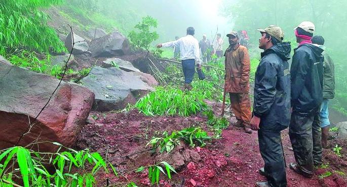 बांबू, सागवानाची झाडे पाषाण कोसळले सेमाडोह-माखला रस्त्यावर सागवान, बांबूची झाडे, मोठे पाषाण रस्त्यावर आले. जेसीबीलाही ते उचलले जाणार नसल्याने ब्लास्टिंग करून रस्ता मोकळा करावा लागणार आहे.