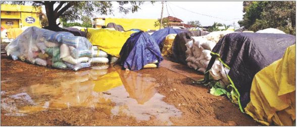 सध्या खुल्या बाजारात बारीक धानाला दोन हजार रुपये प्रती क्विंटल भाव मिळत आहे. तर शासकीय धान केंद्रावर बोनससह रुपये भाव जाहीर झाल्याने शासकीय केंद्रावर ठोकळ धानासह बारीक धानाची आवक वाढली आहे. अशातच धान्य ठेवण्यासाठी योग्य व समतल जागा मिळत नसल्याने मिळेल त्या जागेवर पोती ठेवली जात आहेत. कधी बारदाना संपल्याने तर कधी नैसर्गिक कारणांमुळे केंद्र बंद राहून धान खरेदीला विलंब होत आहे. १५ दिवसांपासून धान खरेदीविना उघड्यावर पडून आहेत. पोती झाकण्यासाठी साधी ताडपत्री दिली जात नाही. त्यामुळे प्रचंड दैना सुरू आहे.मंगळवारी रात्रीपासून सुरू झालेल्या अवकाळी पावसाची संततधार बुधवारी सकाळीसुद्धा कायम होती. या पावसामुळे धान खरेदी केंद्रांवर उघड्यावर ठेवलेले धान पाण्यात भिजून धान अंकुरले आहेत. आता ओले व अंकुरलेले धान खरेदी करण्यास केंद्रावर मनाई केली जात असल्याने डोकेदुखी वाढली आहे. खरेदी केंद्रावरील धान तात्काळ खरेदी करून न्याय द्यावा, अशी मागणी जोर धरु लागली आहे.