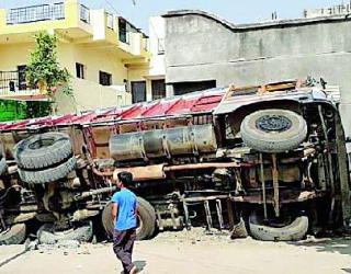 दहाचाकी ट्रक उलटला कुंपणभिंतीवर