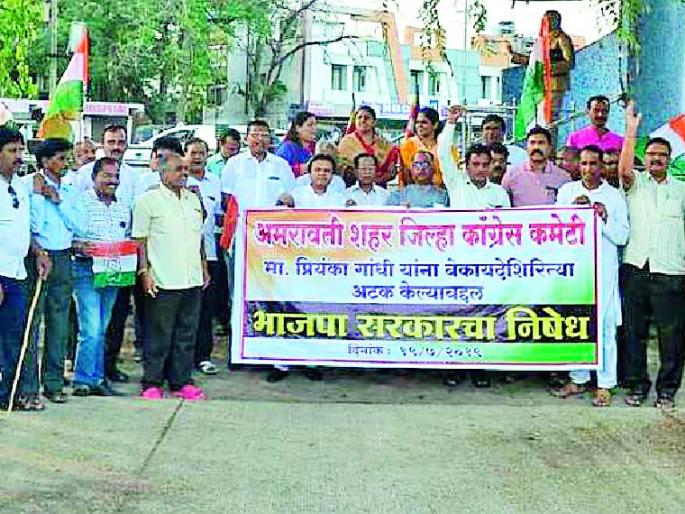 लोकमत न्यूज नेटवर्कअमरावती : अखिल भारतीय कॉग्रेस कमिटीच्या सरचिटणीस प्रियंका गांधी यांना उत्तर प्रदेश पोलिसांनी बेकायदेशीर अटक केल्याच्या निषेधार्थ शुक्रवारी शहर जिल्हा काँग्रेसतर्फे इर्विन चौकात निषेध नोंदविण्यात आला.उत्तर प्रदेशातील सोनभद्र येथे जमिनीच्या वादातून गोळीबार करून १० जणांची हत्या करण्यात आली. या हिंसाचारात बळी गेलेल्या पीडितांच्या कुटुंबीयांना भेटण्यासाठी सोनभद्र येथे जात असताना काँग्रेसच्या सरचिटणीस तथा उत्तर प्रदेशच्या प्रभारी प्रियंका गांधी यांना वाराणसी पोलिसांनी बेकायदेशीर अटक केली. याची वार्ता काँग्रेस कार्यकर्त्यांना कळताच देशभरात प्रियंका गांधी यांच्या अटकेच्या निषेधार्थ शहर काँग्रेसने रस्त्यावर उतरत भाजप सरकारच्या दडपशाही तीव्र निषेध नोंदविला. भाजप सरकारच्या कृतीविरोधात तीव्र घोषणाबाजीने परिसर दणाणून सोडला. आंदोलनात शहर काँग्रेस अध्यक्ष किशोर बोरकर, विलास इंगोले, पुरुषोत्तम मुंदडा, बी.आर. देशमुख, अभिनंदन पेंढारी, हरिभाऊ मोहोड, भैयासाहेब निचळ, कुंदा अनासाने, भास्कर रिठे, गणेश पाटील, सलीम मिरावाले, अतुल काळबांडे, करिमा बाजी, जयश्री वानखडे यांच्यासह पदाधिकारी व कार्यक़र्ते सहभागी झाले होते.युवक काँग्रेसनेही केला निषेधकॉग्रेसच्या सरचिटणीस प्रियंका गांधी यांना उत्तर प्रदेश पोलिसांनी केलेल्या बेकायदेशीर अटके चा शुक्रवारी युवक काँग्रेसने जिल्हा कचेरीसमोर निषेध नोंदविला. यावेळी काळ्या फिती बांधून भाजप सरकारविरोधात घोषणाबाजी करीत परिसर दणाणून सोडला. आंदोलनात युवक काँग्रेसचे प्रदेश महासचिव सागर देशमुख, जिल्हाध्यक्ष पंकज मोरे, नीलेश गुहे, प्रद्युम्न पाटील, अंकुश जुनघरे, रोहित देशमुख, आदित्य पाटील, शुभम वसू, विकास इंगळे, सूरज अडायके, रवि रायबोले, गणेश थावराणी, सौरभ किरकटे आदीचा समावेश होता.