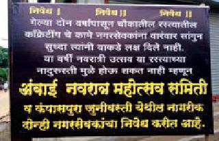 रखडलेले काँक्रिटीकरण : नगरसेवकांमध्येच हमरी-तुमरी बडनेरा : जुन्यावस्तीच्या कंपासपुऱ्यात २ वर्षांपासून रखडलेल्या कामाचा या परिसरातील नागरिकांनी नवरात्र महोत्सवाच्या पहिल्याच दिवशी मैदानात नगरसेवकांच्या नावे निषेध फलक लावून रोष व्यक्त केला. या ठिकाणी दोनही नगरसेवकांमध्ये आरोप-प्रत्यारोपांच्या फैरी झाडण्यात आल्या. कंपासपुऱ्यातील हनुमान मंदिराजवळ मैदानासह रस्त्यावर आमदार निधीतून पेव्हिंग ब्लॉक बसविण्यात आले. हे काम दोन वर्षांपूर्वी करण्यात आले. ज्या ठिकाणी पेव्हींग ब्लॉक बसविले तो जुन्यावस्तीचा मुख्य मार्ग आहे. पेव्हींग ब्लॉक गुळगुळीत असल्यामुळे येथे अपघात होतात. काहींना गंभीर इजा झाल्यात. यामुळे नागरिकांसह इतरही वाहनचालकांनी मैदानातील पेव्हींग ब्लॉक काढण्याची मागणी रेटून धरली. जुन्यावस्तीत या मैदानातून जावे लागते. तेव्हा आमदारांसह नगरसेवकांनी येथे काँक्रीटीकरण करू, असे आश्वासन दिले होते. मात्र दोन वर्षे होऊनही काम झाले नसल्याचे पाहून अंबाई नवरात्र महोत्सव समिती व कंपासपुऱ्यातील नागरिकांनी नगरसेवकांचा निषेध नोंदविला. या मैदानात नवरात्रीचा गरबा, भागवत, प्रवचने, नरकासूर दहन आदी मुख्य कार्यक्रम होतात. फलक ज्या ठिकाणी लावले तेथे नगरसेवक आले होते. त्याच्यातच आरोप प्रत्यारोप झालेत.हनुमान मंदिराजवळच्या मैदानावर काँक्रिटीकरण करण्यासाठी वॉर्ड विकास निधीतून माझे प्रयत्न सुरू आहे. नवरात्री महोत्सव आटोपल्यावर प्रत्यक्ष त्या कामाला सुरुवात करू. कामाची मंजुरी मिळाली आहे. - जयश्री मोरे, नगरसेविका, बडनेरायेथे काँक्रीटीकरण व सौंदर्यीकरण व्हावे, यासाठी महापालिका प्रशासनाकडे पाठपुरावा केला. शहर अभियंत्यांनी त्याची नोटशिट तयार केली. त्याचे दस्तऐवज संबंधित विभागाकडे गेले तेथून ते गहाळ झाल्याचे सांगितले जात आहे. लवकरच काम करू. - विजय नागपुरे, नगरसेवक