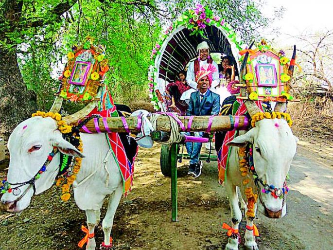 मोहन राऊत ।लोकमत न्यूज नेटवर्कधामणगाव रेल्वे : तालुका तसा ऐतिहासिक, सांस्कृतिक आणि परंपरेचा वारसा जपणारा. मंगरूळ दस्तगीर येथील युवा शेतकऱ्यांने ती जपत आपल्याकडील वऱ्हाडी १५ बैलगाड्यांतून जवळपास १० किमी विवाहस्थळी नेले आणि नवरीलाही सजविलेल्या दमणीतून घरी आणले.तालुक्यातील मंगरूळ दस्तगीर येथील हाडाचे शेतकरी असलेले हरिभाऊ इंगोले यांचा मोठा मुलगा रूपेश यांचा विवाह बाभूळगाव तालुक्यातील घारफळ येथील नानाजी वानखडे यांच्या उच्चशिक्षित शीतल या मुलीशी बुधवारी नायगाव येथे लखाजी महाराज देवस्थान सभागृहात पार पडला. घरी सर्व संपन्नता असतानाही शेतकऱ्याचा मुलगा असल्याने गावातील बैलबंडीने वऱ्हाडी लग्नमंडपी नेण्याचे त्याने ठरविले. नवरदेवासह वऱ्हाडी विवाह सोहळ्यासाठी बैलगाडीने गेल्याने या विषयाची चर्चा गेल्या दोन दिवसांपासून तालुक्यात रंगत आहे.जवळपास १५ बैलगाड्यांनी वऱ्हाडी निघाले. पारंपरिक पायजना व शर्ट परिधान केलेल्या नवरदेवाकरिता सजविलेल्या दमणीचा धुरकरी हा टाय-कोटमध्ये ‘अप टू डेट’ होता. या दमणीला उंचपाठी पंढरपुरी बैलजोडी जुंपली होती. पाठीवर चमकदार झूल आणि रंगवलेल्या शिंगांवर देवांच्या तसबिरी असलेले वाशिंड होते. गावात अनेक वर्षांनतर पहिल्यांदाच बैलजोडीने नवरदेव निघत असल्याने आबालवृद्ध हरखले होते.मंगरूळ दस्तगीर ते नायगाव असा प्रवास करून लग्नकार्य उरकल्यानंतर नवरदेव-नवरी पुन्हा याच बैलगाड्यांनी घरी परतले.शेतकऱ्यांना कितीही जिवावर येत असले तरी बैलजोडीचे महत्त्व अबाधित आहे. आजच्या तरुणांना हे दाखविण्यासाठी तसेच आपल्या परंपरा जतन करण्यासाठी हे पाऊल उचलले.- रूपेश इंगोले, नवरदेव