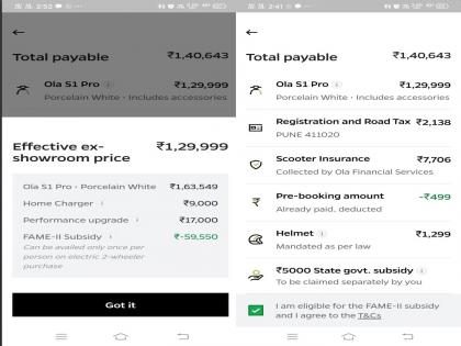 दोन दिवसांपूर्वी एथरने महाराष्ट्रातील ईव्ही सबसिडी लाईव्ह झाल्याने 24000 रुपयांनी स्कूटरची किंमत कमी केली होती. म्हणजे सबसिडीचा फायदा कंपनीने थेट ग्राहकांना दिला होता. तशीच किंमत ओलानेही आज त्यांच्या वेबसाईटवर दाखविली. परंतू खरेदी करताना ओला मूळ किंमतच आकारत आहे. तसेच महाराष्ट्रात फक्त 5000 रुपयेच सबसिडी मिळेल असे दाखवत आहे.
