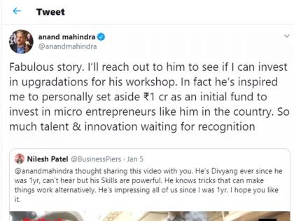 त्यांनी ट्विटरवर विष्णू पटेल यांच्याबाबतीत लिहिलेल्या एका पोस्टवर ट्विट केले आहे. ''छान बातमी आहे. मी विष्णू पटेल यांच्याशी संपर्क करने आणि त्यांच्या वर्कशॉपला अद्ययावत करण्यासाठी मी गुंतवणूक करू शकतो का हे विचारेन. खरेतर मला विष्णू यांनी प्रेरित केले आहे. मी देशाच्या छोट्या उद्योजकांसाठी 1 कोटी रुपयांचा निधी देण्याचा विचार करत आहे. कारण अशा प्रकारचे अनेक शोध आणि त्यांच्यातील हुशारी सर्वांसमक्ष येण्याच्या प्रतिक्षेत आहे.'', असे या ट्विटमध्ये महिंद्रा यांनी म्हटले आहे.
