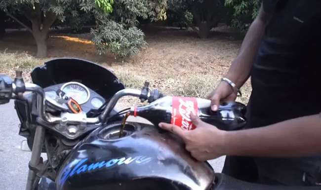 मात्र, एका तरुणाने युट्युबवर व्हिडिओ टाकला असून त्याने चक्क बाईकमध्ये कोका कोला ओतले आहे. आता ही बाईक पुढे गेली की बंद पडली याबाबत सांगणे कठीण आहे. हा व्हिडिओ YASH KE EXPERIMENTS द्वारे युट्युबवर आहे. या व्हिडिओमध्ये Hero Honda Glamour या जुन्या बाईकमधील पेट्रोल पूर्ण काढताना दिसत आहे. यानंतर 2 लीटरची कोका कोलाची बाटली टाकीमध्ये ओतली आहे. यानंतर जे या व्हिडिओमध्ये दिसले ते आश्चर्यचकित करणारे आहे. यामागचे कारण शोधले असता असा तर्क निघतो की, या सॉफ्ट ड्रिंकमध्ये ऑक्सीजन, कार्बन डायऑक्साईड, हायड्रोजन असल्याची शक्यता आहे. हे पदार्थ बाईकला ताकद प्रदान करण्यास समर्थ असण्याची शक्यता आहे.