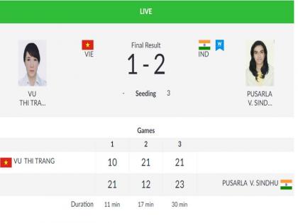 ट्रँगने महिला एकेरीच्या पहिल्याच सामन्यात जागतिक क्रमवारीत आघाडीवर असलेल्या सिंधूला झुंजवले. सिंधूने पहिला गेम 21-10 असा अवघ्या 11 मिनिटांत जिंकून आघाडी घेतली. मात्र ट्रँगने दमदार पलटवार करताना 17 मिनिटांच्या संघर्षानंतर दुसरा गेम 21-12 असा जिंकून सामन्यात चुरस निर्माण केली. चुरशीच्या रंगलेल्या तिसऱ्या गेममध्ये दोन्ही खेळाडूंनी बहारदार खेळ केला. सिंधूला चौथ्या गेम पॉइंटवर सामना जिंकण्यात यश आले. तिने 29 मिनिटांच्या हा गेम 23-21 असा जिंकला.