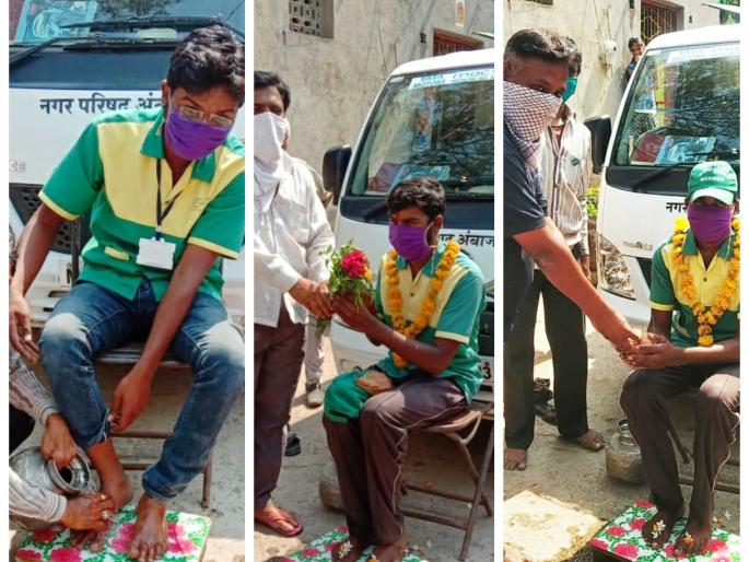 CoronaVirus : अंबाजोगाईत कोरोना योद्धयांचा सन्मान; स्वच्छता कामगारांचे पाय धुऊन व्यक्त केली कृतज्ञता