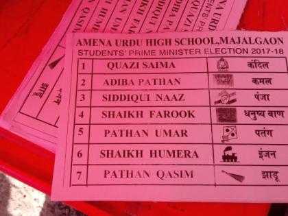 7 उमेदवारांमध्ये 4 उमेदवार मुली होत्या. आज सकाळी 9 ते 11 या वेळेत प्रत्यक्ष मतदान घेण्यात आले.यात 100 टक्के विद्यार्थ्यांनी मतदान केले. मतदान संपल्यानंतर याच ठिकाणी मतमोजणी करुन निकाल जाहिर करण्यात आला. चुरशीच्या या निवडणुकीत आदेबा पठाण ही 24 मते घेवून निवडुन आली. निवडणुकीत सर्व विद्यार्थ्यांनी उत्साहाने सक्रीय सहभाग घेतला. हा उपक्रम यशस्वी होण्यासाठी शाळेचे मुख्याध्यापक जफर सिददीकी, मुन्तेजा ईनामदार आदी शिक्षक, सामाजिक कार्यकर्ते नासेर खान पठाण यांनी प्रयत्न केले.