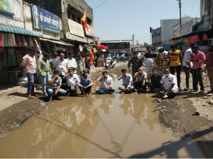 माजलगाव : शहरातील जुन्या मोंढ्यात जागोजागी पाइपलाइन लिकेज झाल्या असून अनेक ठिकाणी नाल्यांचे पाणी रस्त्यावर आल्याने चक्क मोंढ्याचे प्रवेशद्वारच बंद झाले. या प्रश्नाकडे नगर पालिकेचे दुर्लक्ष झाल्याने अखेर मंगळवारी मोंढयातील व्यापाऱ्यांनी या नाल्याच्या पाण्यात बसून आंदोलन केले. नगरपालिकेच्या सुस्त प्रशासनाला जागे करण्यासाठी मंगळवारी व्यापारी महासंघाचे अध्यक्ष सुरेंद्र रेदासनी, सुनील भांडेकर, गणेश लोहिया, वैजनाथ घायतडक,ओंकार कारळकर,कृष्णा भुतडा, दिलीप खुर्पे , धनंजय सोळंके, अशोक बाक्कड ,विठ्ठल श्रीरंग आदी व्यापारी सहभागी झाले होते.