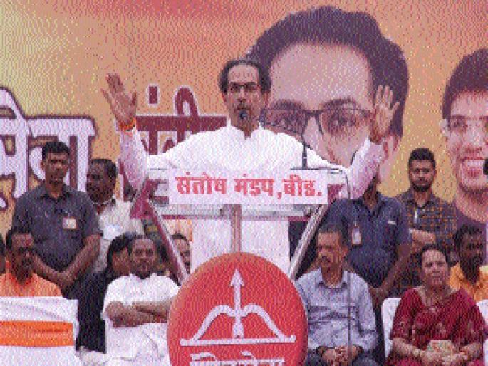 लोकमत न्यूज नेटवर्कबीड : दुष्काळाचे संकट गंभीर आहे. घाबरु नका, खचू नका, आत्महत्या करु नका. दुष्काळाचा सामना करण्यासाठी शिवसेना तुमच्यासोबत आहे. आम्ही दुष्काळाचे राजकारण करत नाहीत, राजकारणापलिकडेही माणुसकी असते. बीड जिल्ह्यातील पशुधन वाचवण्यासाठी शंभर ट्रकच काय त्यापेक्षा जास्त चारा लागला तर उपलब्ध करून देवू. बीड जिल्ह्यातील शेतक-यांच्या जनावरांना वाचवण्यासाठी चारा कमी पडू दिला जाणार नाही असा शब्द शिवसेनेचे पक्षप्रमुुख उद्धव ठाकरे यांनी शेतक-यांना दिला.शिवसेनेच्या वतीने मराठवाड्यातील दुष्काळग्रस्त शेतकºयांसाठी शंभर ट्रक पशुखाद्य वाटपाचा प्रारंभ बुधवारी बीड तालुक्यातील म्हाळसजवळा येथे करण्यात आला. त्यावेळी शेतकºयांशी संवाद साधताना ठाकरे बोलत होते. प्रातिनिधिक स्वरूपात दहा शेतकºयांना पशुखाद्याचे वाटप ठाकरे यांच्या हस्ते करण्यात आले. त्यानंतर ठाकरे म्हणाले, या दुष्काळामध्ये कोरडी भाषणे करून उपयोग होणार नाही, शेतकºयांना मदतीचा हात आणि आधार दिला तरच शेतकरी उभा राहिल. सरकार फक्त घोषणांचा पाऊस पाडेल पण याने मायमाऊलींचे हंडे भरणार नाहीत अशी टीका त्यांनी केली.ते म्हणाले, आज मी येथे जे आलो आहे ते तुमच्या आशिर्वादाची परतफेड करण्यासाठी. सरकार काय करत आहे मला माहित नाही. मी मात्र अशा गंभीर परिस्थितीत तुमच्यासोबत आहे. दुष्काळाचा सामना खंबीरपणे करू, असा विश्वास देताना संधीसाधूंपासून दूर राहण्याचे आवाहन त्यांनी केले. पर्यावरणमंत्री रामदास कदम यांनी भाषण केले. व्यासपीठावर एकनाथ शिंदे, चंद्रकांत खैरे, उपनेत्या निलम गोºहे, अर्जुन खोतकर, व जिल्हा पदाधिकारी आदी उपस्थित होते.स्वातंत्र्य सैनिकाच्या पत्नीने देऊ केलेली मदत उद्धव ठाकरे यांनी सन्मानाने केली परतगेवराईत माजी मंत्री बदामराव पंडित यांच्या निवासस्थानजवळ मैदानावर पक्षप्रमुख उद्धव ठाकरे यांच्या हस्ते पशुधनासाठीची मदत वाटप झाली. शिवसेना राबवत असलेल्या दुष्काळग्रस्त शेतकºयांच्या मदत उपक्रमाला स्वातंत्र्यसैनिक कै. लक्ष्मणराव भोपळे यांच्या पत्नी विजयाताई भोपळे यांनी त्यांच्या पेन्शनमधून २१ हजार रु पयांची मदत अॅड. उज्वला भोपळे यांच्या हस्ते देऊ केली. परंतु पक्षप्रमुख उद्धव ठाकरे यांनी, देशासाठी बलिदान देणाºया स्वातंत्र्य सैनिकाचा शिवसेना नेहमीच सन्मान करते. जवान आणि किसान यांच्या मदतीसाठी शिवसेना सदैव तयार असते. देशासाठी बलिदान दिलेल्या सैनिकाच्या कष्टाची रक्कम शेतकºयाला देण्याऐवजी, शिवसेना शेतकºयांसाठी मदत करून, प्राण पणाला लावेल असा विश्वास देत सन्मानपूर्वक त्यांचा मदतनिधी परत केला.बीडच्या सभेमध्ये तगडा बंदोबस्तम्हाळस जवळा येथील कार्यक्रमानंतर बीड येथे सभा झाली. यावेळ