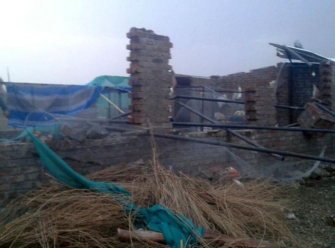 लोकमत न्यूज नेटवर्कबीड : तालुक्यातील ढेकणमोहा परिसरात शुक्रवारी सायंकाळी वादळी वारे आणि गारांसह पाऊस झाल्यामुळे शेतकरी शुभांगी नागेश शिंदे यांच्या घरावरील पत्रे उडून गेले. घरातील अन्न, धान्य, कपडे, गृहोपयोगी वस्तूंचे नुकसान झाले. तसेच कुक्कुटपालनाचे ५० पत्रे उडाल्याने येथील २०० ‘कडकनाथ’ कोंबड्या मृत्यूमुखी पडल्या. शेडची भिंतही पडली. तसेच कुक्कुटपालनासाठी आणलेल्या ५ ते ६ क्विंटल धान्याचे नुकसान झाले.