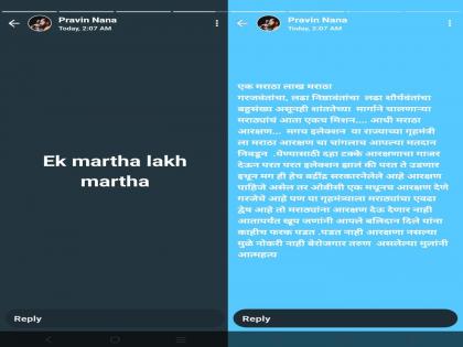 "गरजवंताचा लढा,निष्ठावंताचा लढा,शौर्यवंताचा बहुसंख्ख असुनही शांततेच्या मार्गाने चालणाऱ्या मराठ्याचं आता एकच मिशन आधी मराठा आरक्षण मगच इलेक्शन या राज्याच्या गृहमंत्र्याला मराठा आरक्षणाचा चांगलाच आपल्या मतदान निवडणूक येण्यासाठी दहा टक्के आरक्षणाचे गाजर देऊन परत परत इलेक्शन झाल की तेच घडणार इथुन मागे बद्रीद सरकारने केले आहे.आरक्षण पाहिजे असेल तर ओबीसी मधून आरक्षण देणे गरजेचे आहे.पण या गृहमंत्र्याला मराठ्याचा एवढा द्वेष आहे. तो मराठ्याना आरक्षण देऊ देणार नाही. आज पर्यंत खूप जणांनी आपले बलिदान दिले आहे. यांना काहीच फरक पडत नाही. आरक्षण नसल्यामुळे नोकरी नाही बेरोजगार तरूण असलेल्या मुलांनी आत्महत्या..." असे टेस्टस त्याने ठेवले होते.