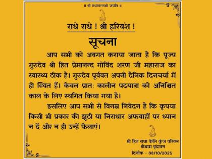 प्रेमानंद महाराजांच्या आश्रमाने सोशल मीडियावर पसरणाऱ्या अफवांचे खंडन केले असून, महाराजांच्या आरोग्याबद्दलची नेमकी आणि सत्य माहिती सर्वांपर्यंत पोहोचवली आहे. आश्रमाने स्पष्ट केले आहे की, महाराजांची प्रकृती ठीक आहे आणि स्थिर आहे. प्रकृती खालावल्याच्या बातम्यांमध्ये कोणतेही सत्य नाही. तशा अफवांवर अजिबात विश्वास ठेवू नका. सध्या त्यांची पदयात्रा थांबवली असून काही काळातच प्रवचने सुरु करतील.