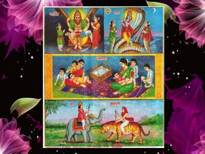 जिवती प्रतिमेत प्रथम नरसिंह, नंतर कालियामर्दन करणारा कृष्ण, मध्यभागी मुलांना खेळवणाऱ्या जरा- जिवंतिका आणि सगळ्यात खाली बुध - बृहस्पती (गुरु) यांचा समावेश असतो. याच क्रमात त्यांना पुजले जाते त्याची कारण मिमांसा...