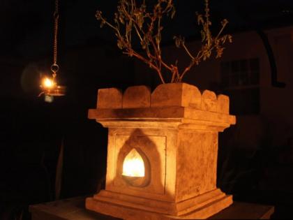 >>तुळशीजवळ रोज सायंकाळी दिवा लावावा आणि दिव्याच्या खाली, मंगल कलशाखाली ठेवतो, तशीच धान्याची छोटीशी राशी रचावी. त्यावर दिवा ठेवावा. ते दृष्य पाहून माता लक्ष्मी प्रसन्न होते. दिव्याच्या स्वच्छ प्रकाशात ते धान्य छोट्या जीव जंतूंना मिळते आणि सत्कर्म घडते.