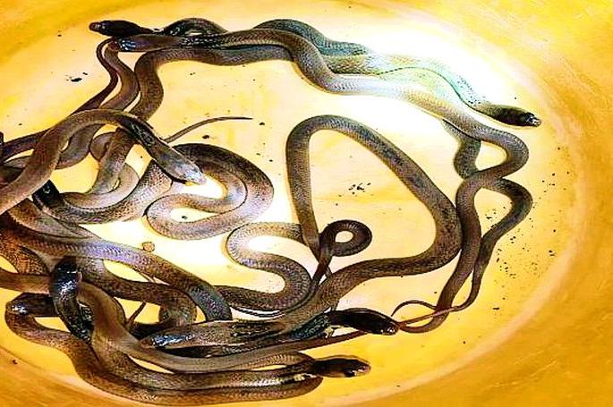 लोकमत न्यूज नेटवर्कमोहाडी : तालुक्यातील मांडेसर येथील किशोर लिल्हारे यांच्या स्वयंपाकघरातून एक दोन नव्हे, तर तब्बल १२ विषारी नाग साप निघाल्याची घटना घडल्याने गावात आश्चर्य व्यक्त केले जात आहे. हे दृश्य बघण्यासाठी लोकांनी एकच गर्दी केली होती. रात्री ९ वाजेच्यादरम्यान स्वयंपाक खोलीतील एका कोपऱ्यात काहीतरी हालचाल होत असल्याचे जाणवल्याने त्या दिशेने बघितले असता, एक-दोन नागाची पिली असल्याचे दिसल्याने घरातील सर्वच घाबरले. त्वरित सर्पमित्रांना फोन करून बोलाविले असता, सुमारे दोन तास चाललेल्या रेस्क्यू ऑपरेशननंतर सर्पमित्रांनी या बाराही सापांना स्वयंपाक खोलीतील वेगवेगळ्या ठिकाणांहून पकडून सुरक्षित ठिकाणी सोडून दिले. तेव्हा कुठे लिल्हारे कुटुंबाच्या जिवात जीव आला व आलेल्या संकटातून त्यांना संरक्षण मिळाले. पावसाळ्याच्या दिवसात ग्रामीण भागात साप निघण्याच्या घटना खूप जास्त प्रमाणात होतात.स्वयंपाकघरात सापाची पिली असल्याची माहिती सर्पमित्र दिनेश गराडे यांना मिळताच त्यांनी त्यांच्या चमूसह घटनास्थळी धाव घेत सापांची शोधाशोध सुरू केली. तेव्हा स्वयंपाक खोलीत एक नव्हे, तर तब्बल १२ विषारी नागाची पिली आढळून आली. बघ्यांची प्रचंड गर्दी झाल्यामुळे सर्व साप पकडायला दोन तास लागले. सर्पमित्र दिनेश गराडे, दीपक नागपुरे, मुन्ना बोरकर यांनी या सापांची नोंद कान्द्री वन विभागात करून त्यांना सुरक्षित ठिकाणी सोडले. तब्बल १२ विषारी नाग साप निघाल्यामुळे परिसरात भीतीचे वातावरण निर्माण झाले आहे. तत्पर मदत मिळाल्यामुळे किशोर लिल्हारे यांच्या कुटुंबियाने सर्पमित्रांचे आभार मानले आहे, मात्र आताही स्वयंपाक खोलीत जाताना त्यांना भीती वाटत आहे.