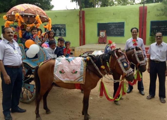 लोकमत न्यूज नेटवर्कभंडारा : शाळेचा पहिला दिवस अभिनव पद्धतीने साजरा करण्याचे निर्देश शिक्षण विभागाने दिले होते. त्या अनुषंगाने येथील जनता विद्यालयात चक्क घोडागाडीत विद्यार्थी बसून शाळेत प्रवेश केला. या आगळ्या वेगळ्या स्वागताने चिमुकले विद्यार्थी व पालक भारावून गेले.फुलांनी सजविलेल्या घोडागाडीने सुमारे ७५ विद्यार्थ्यांनी टप्प्याटप्प्याने शाळेत प्रवेश केला. नवागतांचे स्वागत पुष्पगुच्छ देऊन करण्यात आले. वर्ग ५ व ८ च्या विद्यार्थ्यांना गोड जेवण (खीर) देण् यात आली. फुलांनी सजविलेली घोडागाडी पाहून विद्यार्थी आनंदित झाले. विद्यार्थ्यांनी प्रथमच घोडागाडीत बसण्याचा आनंद घेतला. शाळेच्या पहिल्या दिवशी नवागतांना खूप मजा आली. शाळेत पुस्तक दिन व राजश्री शाहू महाराज जयंती साजरी करण्यात आली.याप्रसंगी मुख्याध्यापक सुनिल नासरे, उपमुख्याध्यापक एस.एन. लंजे, पर्यवेक्षक भेलकर, शिक्षकवृंद पंकज बोरकर, राजू गभणे, अजय बोरकर यांनी पुस्तक दिनाचे महत्व सांगितले. याप्रसंगी शिक्षिका कटरे, बिसेन, बावनकर, गाढवे , आरामे व शिक्षकवृंद तथा पालकवृंद उपस्थित होते.