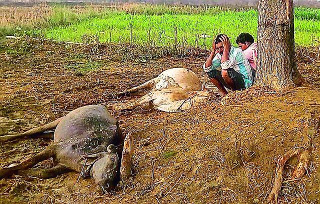 रोहिणी व मृगाच्या जोडनक्षत्राचा योग जुळला. वादळी वाºयासह पाऊस झाला. मेघांची गर्जना रात्री होत होती. लखलखणारी ती वीज कुठेतरी काही उद्ध्वस्त करुन गेली असेल असा अंदाज येत होता. अनेकांचा तो अंदाज खरा ठरला. रोहणा या गावशेजारी बेटाळा रस्त्यावरच्या शिवारात नेहमीप्रमाणे पुरुषोत्तम पंचबुध्दे यांनी जनावरे बांधलेली होती. निबांच्या झाडाला एक बैल तर दुसरा बैल औताला बांधला होता. शेजारीच म्हशीचा पिल्लू (वघार) बांधलेली होती. जनावरांना पाणी पाजले. खायला वैरण देवून पुरुषोत्तम घरी आले. पण, रात्री वीजेने डाव साधला. निंबाच्या झाडावर वीज कोसळली. त्यात झाडाला बांधलेला एक बैल व शेजारी असलेली म्हशीचा तो मोठा झालेला बछडा जागीच तडफडून मृत झाला. औता बांधलेल्या बैलाने झटका दिला. बांधलेला दावा तुटला व तो पळण्यास यशस्वी ठरला. तरीही तो काहीसा जखमी झाला. वीजेच्या लख्ख प्रकाशाने त्या बैलाचे डोळे पणती कमजोर झाली. त्या बैलाला दिसत नसल्याचे सांगण्यात आले. वैरण अन् पाणी देवून आलेला पुरुषोत्तम निवांतपणे झोपला. सकाळी उठून तो शिवाराकडे गेला. झाडाखाली मृत पडलेली जनावरे बघून तो स्तब्धच राहिला. त्याने डोक्यावर हात मांडत आलेल्या संकटाची परिक्षाच बघीतली. या घटनेची खबर मिळताच रोहणाचे सरपंच नरेश ईश्वरकर, ग्रा. पं. सदस्य देवचंद सेलोकर, नितेश मारवाडे, संदीप बोंदरे यांनी घटनास्थळ गाठले.
