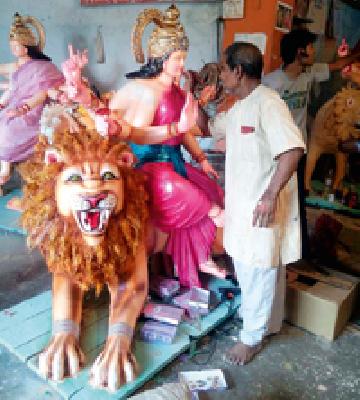 अखेरचा हात... मंगळवारी जिल्ह्यात सर्वत्र नवरात्रोत्सवास प्रारंभ होत आहे. जिल्ह्यात ९०० च्या आसपास दुर्गामूर्तीची स्थापना होणार आहे. मूर्तीवर रविवारी अखेरचा हात फिरविताना वर्धेतील मूर्तिकार.