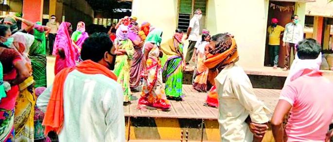 राहुल भुतांगे।लोकमत न्यूज नेटवर्कतुमसर : तुमसर कृषी बाजार समीतीत सोशल डिस्टन्सिंग ठेवून शेतमाल खरेदी विक्रीचा व्यवहार सुरू करण्यात आला. परंतू बाजार समितीच्या मार्केट यार्डात शेतकऱ्यांनी विक्रीस आणलेल्या शेतमालाच्या लिलावावरुन शेतकरी, हमाल, मापारी, अडते, व्यापारी यांच्यात सामाजिक अंतर ठेवण्यात आले नाही. त्यामुळे चक्क बाजार समितीच्या यार्डात सोशल डिस्टन्सिंगचा फज्जा उडाल्याचे चित्र दिसून आले.देशासह राज्यात कोवीड १९-कोरोना व्हायरस विषाणूचा प्रादूर्भाव रोखण्यासाठी जिल्हात सर्वत्र लॉकडाऊन करण्यात आला असून, काही जीवनावश्यक वस्तूबरोबर कृषीविषयक उद्योगधंद्यांना लॉकडाऊन मध्ये काही प्रमाणात सुट देण्यात आली. त्याच धर्तीवर कृषी उत्पन्न बाजार समितीच्या मार्केड यार्डावर शेतकऱ्यांना शेतमाल विक्रीस आणता यावा व त्यांना लॉकडाऊनच्या काळात उदरनिर्वाह करण्यासाठी आर्थिक व्यवहार करण्यासंबधी राज्यातील शेतकºयांना शेतमाल खरेदी विक्रीची मुभा देण्यात आली. त्यामुळे येथील बाजार समीती प्रशासनाच्या वतीने काही नियम अटी घालून शेतकºयांनी विक्रीस आणलेल्या मालाची थेट बाजार समीतीच्या धर्मकाट्यावर वजन करून माल खरेदी विक्रीचा व्यवहार सुरू करण्यात आला. परंतू २० एप्रिल रोजी सकाळी १०.३० वाजताच्या सुमारास जेव्हा बाजार समितीत शेतकºयांच्या शेतमालाचा वजनमाप धर्मकाट्यावर करायला सुरुवात करण्यात आली. तेव्हा येथील संतप्त महिला व पुरुष मापारी, मजुरांनी चक्क काही काळ बाजार समितीच्या वजन काट्याजवळ आपला ठिय्या मांडला. जो पर्यंत बाजार समितीत आमच्या हाताला काम मिळणार नाही तोपर्यंत आम्ही शेतकºयांच्या शेतमालाचा वजनमाप धर्मकाट्यावर करू देणार नाही, असा आक्रमक पवित्रा घेत ठिय्या मांडला.दरम्यान महिला मजुरांकडून वजनमाप करणारे वाहने रोखून धरण्यात आले. काही काळ व्यवहार बंद करण्यात आला. त्यावेळी बाजार समितीचे सचिव व सहसचिव व संचालक सेलोकर यांनी वजन काट्याकडे धाव घेत सदर मजुरांची समजूत काढण्याचा प्रयत्न केला. मात्र संतप्त महिला मजूर व मापारी हे काहिही ऐकण्याच्या स्थितीत नव्हते.ज्या प्रमाणे बाजार समीतीच्या खुल्या मार्केट यार्डात सामाजिक अंतर राखून शेतकऱ्याच्या शेतमालाचा, खरेदी विक्रीचा व्यवहार केला जात होता. मालाचा वजनमाप हात काट्याने करून, येथील व्यापारी, अडते, मापारी, महिला पुरूष हमालांच्या हाताला काम मिळत होता. परंतु आजघडीला सोशल डिस्टन्सिंगचे नियम पाळत बाजार समितीने शेतकºयांचा शेतमाल खरेदी विक्रीचा व्यवहार करतांना गर्दी टाळण्यासाठी शेतमालाचा वजनमाप हा धर्मकाट्यावर करण्याचा निर्णय घेतला. त्यात व्यापारी, अडते, शेतकरी, यांचा व्यवहार सुरू झाला. परंतु येथील ह