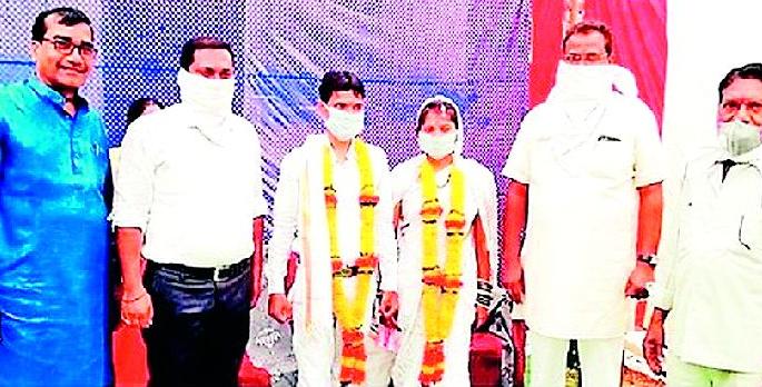 लोकमत न्यूज नेटवर्कबोंडगावदेवी : कोरोनाच्या पार्श्वभूमीवर लग्न समारंभात कोणताही बडेजाव न करता शासकीय नियम व अटींची पुर्तता येथील एका विवाह समारंभात करण्यात आली. येथील रहिवासी व गोंदिया जिल्हा परिषदेचे माजी अध्यक्ष चंद्रशेखर ठवरे यांच्या मुलाचा विवाह अगदी साध्या पद्धतीने मोजक्या आप्त स्वकीयांच्या उपस्थितीत पार पडला. शारीरिक अंतर ठेवून नवदाम्पत्यांसह इतरांनी मास्क वापरून उपस्थिती दर्शविली.जिल्हा परिषदेचे माजी अध्यक्ष चंद्रशेखर ठवरे यांचे चिरंजीव सुजीत यांचा विवाह गावातीलच सुरेश रामटेके यांची मुलगी काजल यांच्याशी सामाजिक रितीरिवाजाप्राणे ४ महिन्यांपुर्वीच ठरला होता. दोन्ही पक्षाकडून २६ मे ही तारीख विवाहाची निश्चित करण्यात आली होती. मुला-मुलींच्या वडिलांनी लग्नपत्रिका सुद्धा छापून घेतल्या व लग्नाची तयारी झाली होती. मात्र अचानक कोरोनाचा शिरकाव झाला व प्रादुर्भाव थांबविण्यासाठी ‘लॉकडाऊन’ तसेच संचारबंदी घोषीत करण्यात आली. यात विवाह सोहळयांवर निर्बंध लादण्यात आले. विवाह ठरलेल्या दिवशीच करायचा असा दोन्ही बाजूंनी ठरवले व कोणताही बडेजाव न करता अगदी साध्या पद्धतीने गावामधील मोजक्या लोकांच्या उपस्थितीत मंगळवारी (दि.२६) ‘शुभमंगल’ लावण्यात आले. विवाह समारंभाचे साक्षी होण्यासाठी गावचे सरपंच राधेशाम झोळे, माजी जि.प. सदस्य डॉ.शमकांत नेवारे, माजी पं.स. सदस्य प्रमोद पाऊलझगडे, तंमुसचे अध्यक्ष अधि. श्रीकांत बनपुरकर यांची उपस्थिती होती. बौद्ध विधीचे पठन करून एकनाथ बोधी यांनी नवदाम्पत्यांना विवाह बांधणात बांधले. उपस्थितांनी पुष्पवर्षाव करून आशीर्वाद दिला.