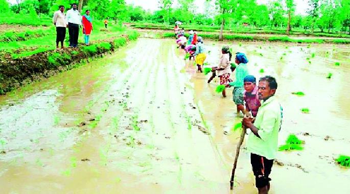 पालांदूर येथील प्रगतशील शेतकरी टिकाराम भुसारी यांच्या शेतात केवळ १८ दिवसांच्या पऱ्ह्यांची रोवणी सुरु आहे. दोरीने एका रेषेत पूर्व पश्चिम दिशेचा आधार घेत नेऋत्य वाऱ्यांचा अभ्यास करीत रोवणी आटोपली आहे. २० बाय १५ सेमी दोन रोपाचे अंतर सुरक्षीत ठेवण्यात आले आहे. मंडळ कृषी अधिकारी गणपती पांडेगावकर, कृषी सहायक वैशाली खंदाडे उपस्थित होते.