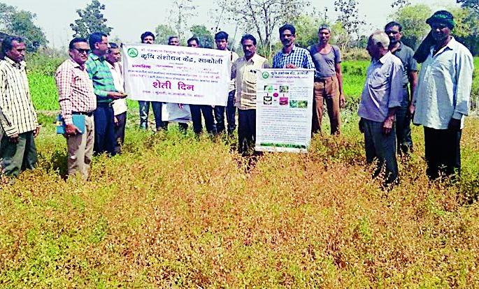 लोकमत न्यूज नेटवर्कसाकोली : हरभरा उत्पादक शेतकऱ्यांमध्ये जैविक कीड व्यवस्थापनासंबंधी जनजागृती व्हावी व आपल्या विभागात त्याच्या कीड नियंत्रणासाठी वापर वाढावा या उद्देशाने कृषी संशोधन केंद्र, साकोली मार्फत मौजा कुंभली ता.साकोली येथे रबी हंगाम २०१८-१९ मध्ये नऊ शेतकऱ्यांच्या शेतावर हरभऱ्यावरील घाटेअळीच्या व्यवस्थापनाकरिता एच.ए.एन.पी.व्ही. प्रती हेक्टर ५०० रोगग्रस्त अळ्यांच्या अर्काचा वापर यावर प्रात्यक्षिक घेण्यात आले. त्या अनुषंगाने कृषी संशोधन केंद्र, साकोली व कृषी विभाग साकोली यांच्या संयुक्त विद्यमाने कुंभली येथे शेतीदिन आयोजित करण्यात आला.या कार्यक्रमाला कृषी संशोधन केंद्राचे कनिष्ठ कीटकतज्ज्ञ डॉ.बी.एन. चौधरी, कृषी विभाग साकोलीचे कृषी पर्यवेक्षक आर.ए. खोब्रागडे, सुकळीचे कृषी सहाय्यक एच.सी. चव्हाण हे उपस्थित होते. या शेतीदिनामध्ये डॉ.चौधरी यांनी हरभऱ्यावरील घाटेअळीची ओळख, जीवनक्रम व एकात्मिक व्यवस्थापनाबाबत विस्तृत माहिती दिली.यासोबतच या किडीच्या व्यवस्थापनामध्ये एचएएनपीव्ही प्रती हेक्टर ५०० रोगग्रस्त अळ्यांच्या अर्काचा वापराचे महत्व विशद करून याचा वापर हरभरा उत्पादक शेतकऱ्यांनी करावा असे आवाहन केले.खोब्रागडे यांनी कृषी विभागामार्फत राबविलेल्या हरभऱ्यावरील प्रात्यक्षिकांची माहिती दिली. शेतकऱ्यांचा उत्स्फूर्त प्रतिसाद लाभलेल्या या शेतीदिनाचे संचालन व आभार प्रदर्शन चव्हाण यांनी केले. या कार्यक्रमासाठी मन्साराम भेंडारकर व कृषी संशोधन केंद्राचे रामशेखर भेंडारकर यांचे सहकार्य लाभले.