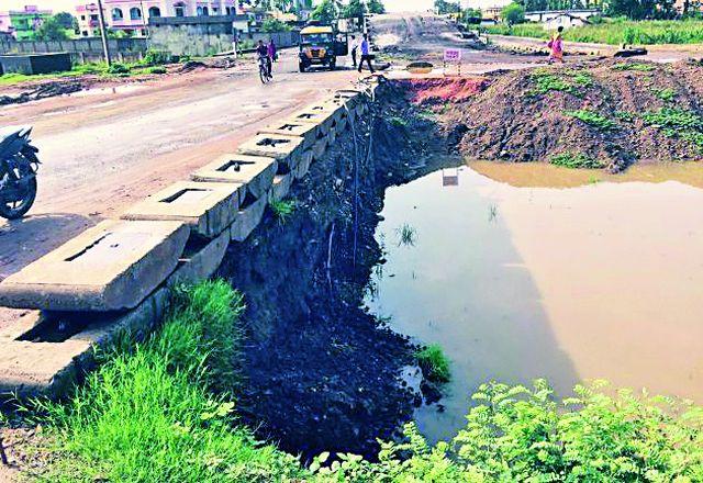 एक महिन्यापासून काम बंद आहे. पावसाचे पाणी खड्ड्यात साचले असून तलावाचे रुप खड्ड्याला आले. १० ते १२ फूट खोल खड्डा आहे. खड्ड्याला लागूनच तुमसर गोंदिया राज्य मार्ग आहे. खड्ड्याच्या काठावर जड वाहतूक करणारे ट्रक उभे राहतात. खड्ड्याला सुरक्षिततेचे कवच नाही. केवळ एका बाजूला सिमेंट दगड लावण्यात आले आहेत. पावसाळ्यात भूस्खलन होऊन रस्ता खड्ड्यात जाण्याची शक्यता नाकारता येत नाही. ५० ते ६० व ७० टनाचे ट्रक येथून दररोज ये जा करतात. नियोजनाचा अभाव येथे दिसून येतो. उड्डाणपुलाची कामेही कासवगतीने सुरु आहेत. राज्य शासन व रेल्वे विभागाचा संयुक्त उड्डाणपुल आहे. मागील चार वर्षापासून कामे सुरु आहेत. रेल्वेने कामाला काही दिवसापूर्वी सुरुवात केली. मोठी यंत्रे आणून ठेवली. यंत्राने व वाहनाने जागा व्यापली, परंतु कामे अजूनपर्यंत सुरु झाली नाही. एक दोन कामे वगळता कामे जैसे थेच आहेत.