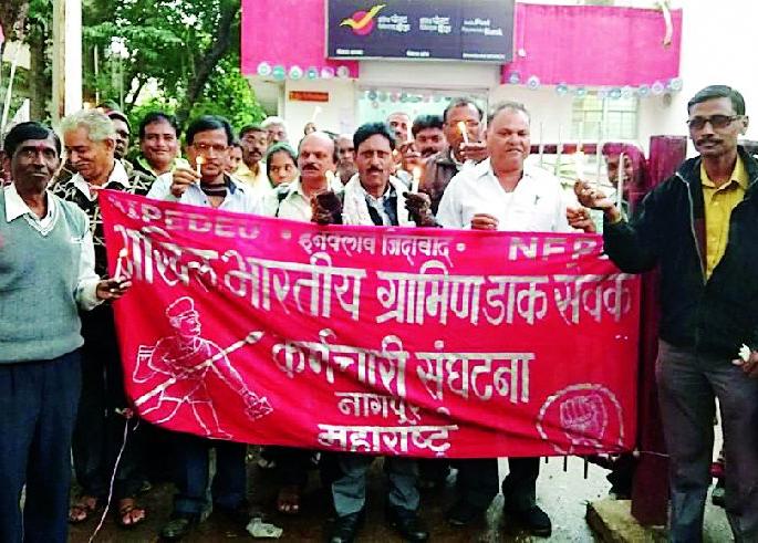 लोकमत न्यूज नेटवर्कभंडारा : आधुनिक संचार माध्यमाच्या काळातही आपले अस्तित्व टिकवून असलेल्या पोस्ट खात्याच्या ग्रामीण डाकसेवकांनी देशव्यापी संप मंगळवारपासून पुकारला आहे. या संपात जिल्ह्यातील ४०० वर पोस्टमन, पोस्टमास्तर सहभागी झाले आहेत. परिणामी ग्रामीण भागातील डाकसेवा ठप्प झाली आहे. दरम्यान मंगळवारी जिल्ह्यातील कर्मचाऱ्यांनी कँडल मार्च काढून शक्तीप्रदर्शन केले.आॅल इंडिया ग्रामीण डाक सेवक संघटना आणि नॅशनल युनीयन आॅफ ग्रामीण डाकसेवक संघटनेच्या वतीने आपल्या विविध मागण्यांसाठी देशव्यापी संप पुकारला आहे. या संपात भंडारा जिल्ह्यातील डाकसेवक सहभागी झाले आहेत. जिल्ह्यात ग्रामीण भागात सुमारे १२३ पोस्ट आॅफीस आहेत. तेथील ४०० वर कर्मचारी या संपात सहभागी झाले. त्यामुळे ग्रामीण भागातील मनीआॅर्डर सेवा, रजिस्ट्री पत्र, आरडी, वीज बिल भरणा, सुकन्या योजनेचे काम आजपासून ठप्प झाले आहेत.दरम्यान भंडारा जिल्ह्यातील कर्मचाºयांनी सोमवारी सायंकाळी येथील मुख्य डाक घरासमोरून कँडल मार्च काढला. यामध्ये अनेक कर्मचारी सहभागी झाले होते. या आंदोलनात संघटनेचे सचिव आर.एस. लिल्हारे, महाराष्ट्राचे सर्कल असीस्टंट सेक्रेटरी जनार्दन कावळे, राजेंद्र ठवकर, प्रभाकर उरकुडकर, किशोर येटरे, एम.एम. बागडे, टी.जी. कापगते, ए.के. वनस्कर, व्ही.एस. शेंडे, आर.जी. वंजारी, उकंडराव बारई, जे.पी. रंगारी, एम.टी. राऊत, आर.डी. ठाकरे, एस.यु. तिरपुडे, वाय.के. तिडके, व्ही.ई. भोयर, एस.एन. कोरे, एस.सी. मदनकर, एम.आर. भुसारी, व्ही.एच. वैरागडे, डी.पी. हटवार, एस.एन. जावळे, व्ही.एम. बडोले, सी.जी. लांबट सहभागी झाले होते. या आंदोलनाला आयटकचे हिवराज उके यांनी भेट देऊन समर्थन दिले आहे.या आहेत मागण्याग्रामीण डाकसेवकांना १ जानेवारीपासून सेवानिवृत्तीचे फायदे द्यावे, दीड लाखांऐवजी पाच लाख रुपये ग्रॅज्युएटी द्यावी, ३० दिवसांची पगारी रजा मंजूर करावी, शैक्षणिक भत्ता द्यावा, कमलेश चंद्रा कमिटीच्या शिफारसी मान्य कराव्या, सिंगल हँड ब्रँचेस अपग्रेड कराव्या, ग्रामीण डाकसेवक कर्मचाºयांना आठ तासांचे काम देवून सिव्हील सर्व्हंड डिजीएस कर्मचारी करण्यात यावे, या मागण्यांसाठी हा संप पुकारण्यात आला आहे.