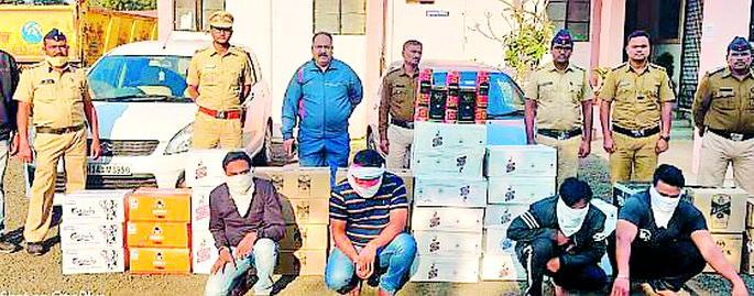 पोलीस उपनिरीक्षक गिरीश राणे सहाय्यक फौजदार शेंडे, सिंगाडे रात्रगस्तीवर असताना, राष्ट्रीय महामार्ग खरबी नाका दरम्यान संशयीत चारचाकी दोन गाड्यांना थांबविण्यात आले. चारचाकी गाडीनंबर एम. एच.३४ के. २०३४ यातील चालक दिपक शांताराम दुमाने (३०), प्रशांत सदाशिव निंबाळकर (३९), दुसरी गाडी क्रमांक एम. एच. ३४ ए.एम. चे चालक अभय बाबुराव बनपूरकर (४५), व आशिष भाऊराव बडवाईक (३०) सर्व राहणार चंद्रपूर यांच्या वाहनातून दारू वाहतूक करताना आढळले.