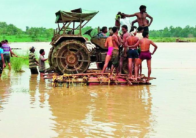 मागील पाच दशकांपासून पुलाची मागणी होत असलेल्या सोनी-आवळी नदी पात्रात अचानकपणे पाण्याची पातळी वाढल्याने नदी पलिकडच्या आवळी येथे सात दिवसांपासून अडकलेले सहा ट्रॅक्टर रॉकेलच्या रिकाम्या २१ ड्रमवर मांडून चक्क दुथडी नदी पार करण्यात आले.