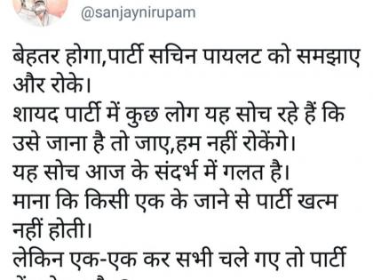 कॉंग्रेसचे माजी खासदार संजय निरुपम यांचे टिष्ट्वटही थेट गांधी कुटुंबालाच लक्ष्य करणारे होते. ते म्हणतात, ‘‘सचिन पायलट यांना समजवल्यास आणि थांबविल्यास बरे होईल. बहुधा पक्षातील काही लोक असा विचार करीत आहेत, की ज्यांना जायचे असेल, त्यांनी जावे. आम्ही थांबविणार नाही. सध्याच्या परिस्थितीत हा विचार चुकीचा आहे. एक-एक जण सोडून गेल्याने पक्ष संपणार नाही, हे खरे; पण अशा प्रकारे एक-एक जण सोडून गेल्यास पक्षात शिल्लक तरी कोण उरेल?’’