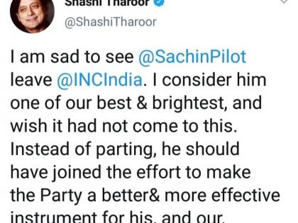 सिब्बल यांच्यानंतर शशी थरूर यांनीही टिष्ट्वटरच्या माध्यमातून पायलट यांच्या बंडावर प्रतिक्रिया व्यक्त केली. ‘‘सचिन पायलट हे पक्षाच्या सर्वोत्तम आणि सर्वात हुशार नेत्यांपैकी एक होते. त्यांनी पक्ष सोडायला नको होता. ते पक्षातून गेल्याचे आपल्याला दु:ख झाले आहे.’’ असे टिष्ट्वट थरूर यांनी केले. गंमत म्हणजे पायलट यांनी अद्यापही पक्ष सोडलेला नाही अथवा त्यांना पक्षानेही बाहेर काढलेले नाही! कॉंग्रेसच्या विरोधात झेंडा उंच केलेल्या नेत्याची दुसऱ्या नेत्याने तारीफ केल्याचे उदाहरण कॉंग्रेसच्या स्वातंत्र्योत्तर इतिहासात तरी सापडणे कठीण आहे. थरूर बोलघेवडे म्हणून ख्यात असले तरी, ज्या नेत्याने थेट पक्षाच्या नेतृत्वालाच आव्हान दिले आहे, त्या नेत्याची प्रशंसा करणे हे जरा जास्तच झाले!