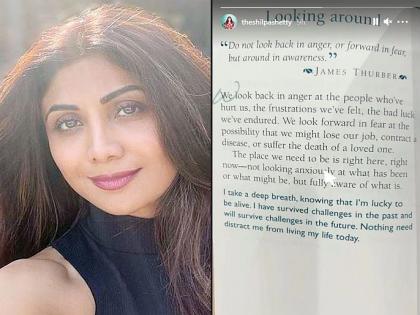 शिल्पा शेट्टीने गुरुवारी रात्री, इंस्टाग्राम स्टोरीवर एका पुस्तकाच्या पानाचा फोटो पोस्ट केला आहे. तिच्या पोस्टमध्ये जेम्स थर्बरच्या उद्धरणावर प्रकाश टाकण्यात आला आहे. यात लिहिले आहे, "रागात मागे पाहू नका अथवा भीतीने समोर पाहू नका, त्याऐवजी जागरूकतेनं पाहा."