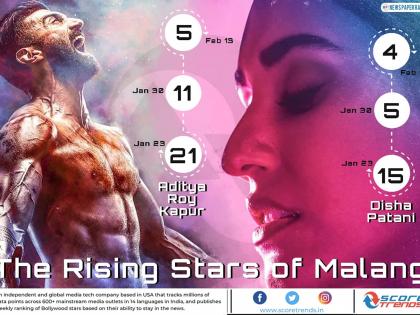 अमेरिकेच्या स्कोर ट्रेंड्स इंडिया ह्या मिडिया-टेक कंपनीने लोकप्रियतेच्या निकषांवर आधारित ही लिस्ट दिली आहे. ह्या आकडेवारीनूसार, मलंगचा प्रोमो येण्याअगोदर, आदित्य रॉय कपूर आणि दिशा पटानीची रॅकिंग अनुक्रमे, 21 (23 जनवरी) आणि 15 (23 जनवरी) अशी होती. फिल्मचे फस्ट पोस्टर आणि प्रोमो आल्यानंतर एका आठवड्यातच ह्या दोघांच्या धमाकेदार केमिस्ट्रीविषयीच्या चर्चा रंगल्या. खास करून, युवा वर्गात ह्यांची लोकप्रियता एवढी वाढली की, दोघंही लोकप्रियतेची शिखरं पादाक्रांत करत गेले. आदित्य 21वरून 11 व्या क्रमांकावर पोहोचला तर दिशा 15 व्या क्रमांकावरून 5 व्या स्थानी (30 जनवरी) पोहोचली.