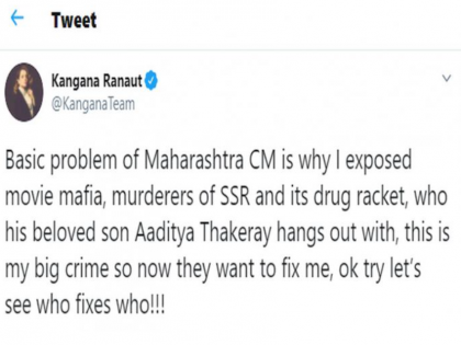 कंगनानं ट्विटरवरून मुख्यमंत्र्यांवर तोफ डागली होती. तिनं ट्विटमध्ये पर्यटनमंत्री आदित्य ठाकरेंच्या नावाचाही उल्लेख केला होता. 'मी मुव्ही माफिया, सुशांतचे मारेकरी आणि ड्रग रॅकेटला उघडं पाडतेय, हीच गोष्ट महाराष्ट्राच्या मुख्यमंत्र्यांसाठी त्रासदायक ठरतेय. मुख्यमंत्र्यांचे लाडके पुत्र आदित्य ठाकरे ज्यांच्यासोबत फिरतात, त्यांना मी उघडं पाडतेय, हीच त्यांची समस्या आहे. हाच माझा सर्वात मोठा गुन्हा आहे,' असं ट्विट कंगनानं केलं होतं.