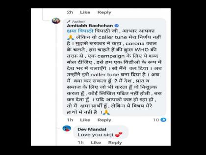 होय, क्षमा त्रिपाठी नावाच्या या चाहतीला कमेंटला उत्तर देताना अमिताभ यांनी माफी मागितली. ‘त्रिपाठीजी, तुमचे आभार. पण ती कॉलर ट्यून माझा निर्णय नाही. कोरोना काळात डब्ल्यूएचओमार्फत एक कॅम्पेन आहे आणि तुम्ही त्याला आवाज द्या, आमही हा व्हिडीओ देशभर दाखवू, असे सरकारकडून मला सांगण्यात आला. आता सरकारने त्याचीच कॉलर ट्यून बनवली. अशात मी काय करणार? मी देशासाठी आणि समाजासाठी जे काही करतो, ते नि:शुल्क करतो. कुठलीही स्क्रिप्ट वगैरे नसते. बस्स, करतो. तुम्हाला या कॉलर ट्यूनचा त्रास होतोय तर मी माफी मागतो. मात्र माझ्या हातात करण्यासारखे काहीही नाही...,’असे अमिताभ यांनी लिहिले.