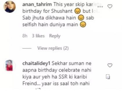 शेखर सुमनने यावर्षी स्वत:चा वाढदिवस साजरा केला नाही, याची आठवणही अनेकांनी तिला करून दिली. संदीप सिंगला तू पार्टीत बोलवले आणि व्हिडीओत लपवले. तुझ्याबद्दल आधी आदर होता. पण आता थोडाही आदर नाही, असे एका युजरने लिहिले. अर्थात काहींनी अंकिताची बाजू घेत, तिला सपोर्टही केला. सुशांत हा अंकिताचा भूतकाळ होता. तिलाही आनंदी राहण्याचा अधिकार आहे, असे म्हणत अनेकांनी तिची बाजू मांडली.