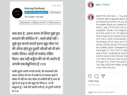 आरती बजाजने आपल्या इन्स्टाग्राम पोस्टवर लिहिले की, 'अनुराग कश्यप तू रॉकस्टार आहेस. ज्याप्रकारे तू महिलांना सशक्त करतो, तसं करणं आणि त्या सर्वांसाठी सुरक्षित स्थळ तयार करणं सुरू ठेव. हे मी सर्वातआधी आपल्या मुलीत बघते. जगात जराही इमानदारी शिल्लक राहिलेली नाही आणि जगात बेकार लोक भरलेले आहेत. जर हे लोक त्यांच्या ऊर्जेचा वापर द्वेष पसरवण्यात लावत नसते आणि त्याचा रचनात्मक वापर झाला असता तर जग आणखी चांगलं झालं असतं.