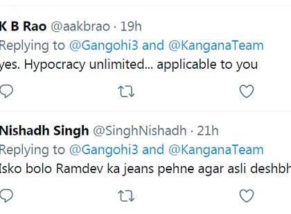 इतकेच नाही, सोशल मीडियावर कंगनाच्या फाटक्या जीन्समधील फोटोंचा अख्खा अल्बम खुला केला आहे. ढोंगीपणाचा, दांभिकतेचा कळस, असे लिहित युजर्सनी कंगनाचे पाश्चात्य कपड्यांमधील फोटो शेअर केलेत. इतकी मोठी देशभक्त आहे तर हिला रामदेव बाबाची जीन्स घाल म्हणावं, असे एका युजरने लिहिले.