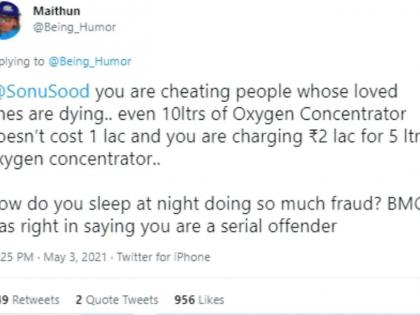 त्याचे झाले असे की, ऑक्सिजन कंसंट्रेटर मशिनच्या एका जाहीरातीच्या पोस्टरवर सोनू सूद झळकला होता. पोस्टवर असलेले ऑक्सिजन कंसंट्रेटर मशिनची किंमती लाखांत असल्याचे सांगितले गेले होते. याच गोष्टीचा बाऊ करत एका युजरने त्याचा स्क्रिनशॉट सोशल मीडियावर शेअर केला आणि त्यात चिटर फ्रॉड असे म्हटले गेले. यासोबतच त्या युजरने लिहीले होते की, लोकांसोबत चांगले बनण्याचे ढोंग करत आहेस. १० लिटर कंसंट्रेटरची किंमत १ लाख कशी ? असे फ्रॉड केल्यानंतर तुला रात्रीची झोप तरी कशी येते.सोनू सूद वर एका युझरने काही आरोप केले आणि त्यानंतर हा सगळा वाद सुरू झाला.