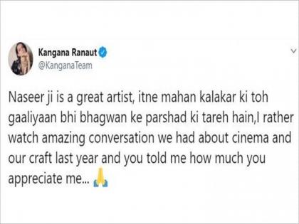 नसीरूद्दीन शाह यांच्या या वक्तव्यावरून अभिनेत्री कंगना रानौत ने त्यांना टोमणा मारलाय. ती ट्विटरवर म्हणाली की, 'इतक्या महान कलाकाराच्या शिव्याही प्रसादासारख्या आहेत. नसीरजी एक महान कलाकार आहेत. इतके महान कलाकार की, त्यांच्या शिव्याही देवाच्या प्रसादासारख्या आहेत. यापेक्षा मी त्यांच्यासोबत सिनेमा आणि गेल्यावर्षी आमच्या क्राफ्टवर झालेलं शानदार कन्व्हर्सेशन बघणं पसंत करेन. जेव्हा तुम्ही म्हणाले होते की, तुम्हाला माझं काम किती आवडतं'.