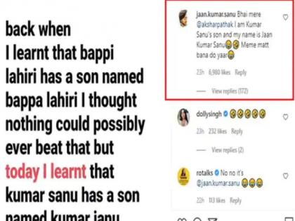 भाई मेरे अक्षर पाठक, मी कुमार सानूचा मुलगा आहे आणि माझे नाव जान कुमार सानू आहे. मीम मत बना दो यार, असे या पोस्टवर उत्तर देताना जान कुमार सानूने लिहिले.