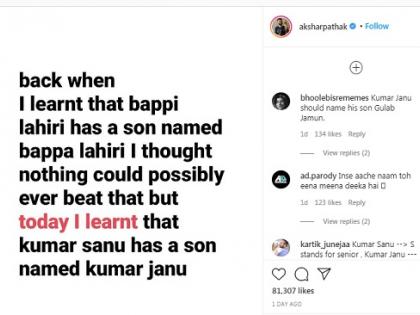 ‘बप्पी लाहिरीच्या मुलाचे नाव बप्पा लाहिरी आहे, हे जाणून किती हटके, अशी माझी भावना झाली होती. मात्र आजच मला माहिती झाले की कुमार सानूच्या मुलाचे नाव कुमार जानू आहे,’ असे या युजरने गमतीत लिहिले. मग काय, या युजरच्या पोस्टनंतर कुमार सानूच्या मुलाचे नाव सोशल मीडियावर ट्रेंड करू लागले. ही पोस्ट 80 हजारांपेक्षा अधिक लोकांनी लाईक केली. ट्विटरवर या ट्विटला 1500 पेक्षा अधिक लोकांनी रिट्विट केले. इतकेच नाही तर ही पोस्ट इतकी व्हायरल झाली की, खुद्द कुमार सानूच्या मुलाला म्हणजेच जान कुमार सानूला यावर उत्तर द्यावे लागले.